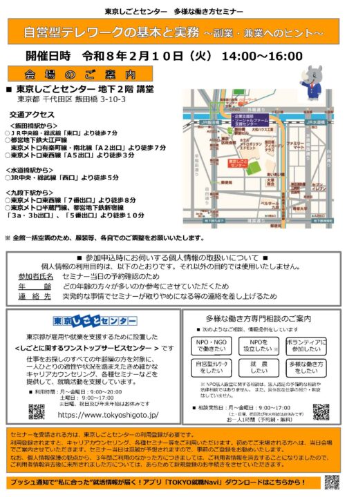 【2月10日(火)開催】多様な働き方セミナー「自営型テレワークの基本と実務~副業・兼業へのヒント~」